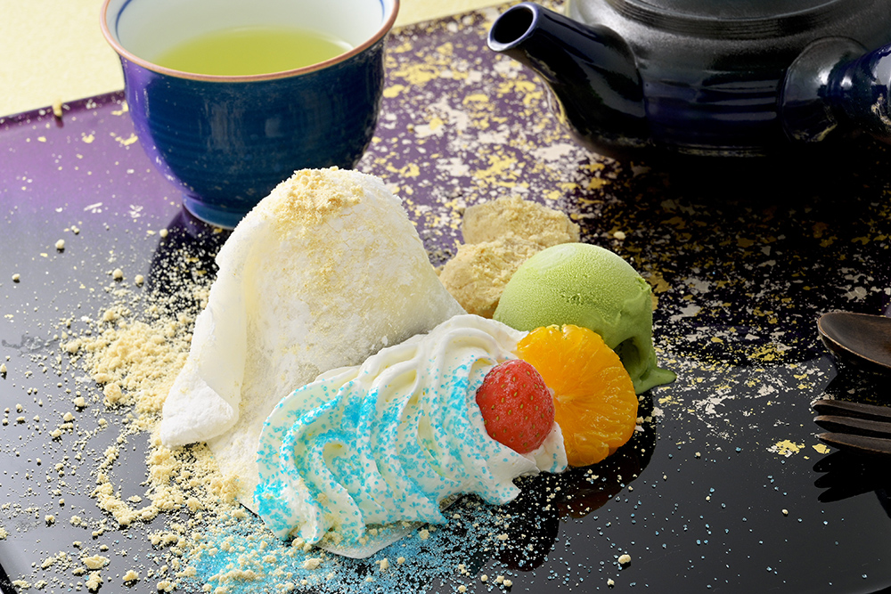 | 内容 | たいらぎ名物「たいら焼き」の上に番らアイスとあんこをのせ求肥で包みました。富士山をイメージし抹茶アイスやフルーツ、わらび餅をトッピングした静岡にちなんだスーツです。ご自身の手で急須から静岡茶をそそいでいただき、できたての香りとともにお召し上がりいただきます。 |